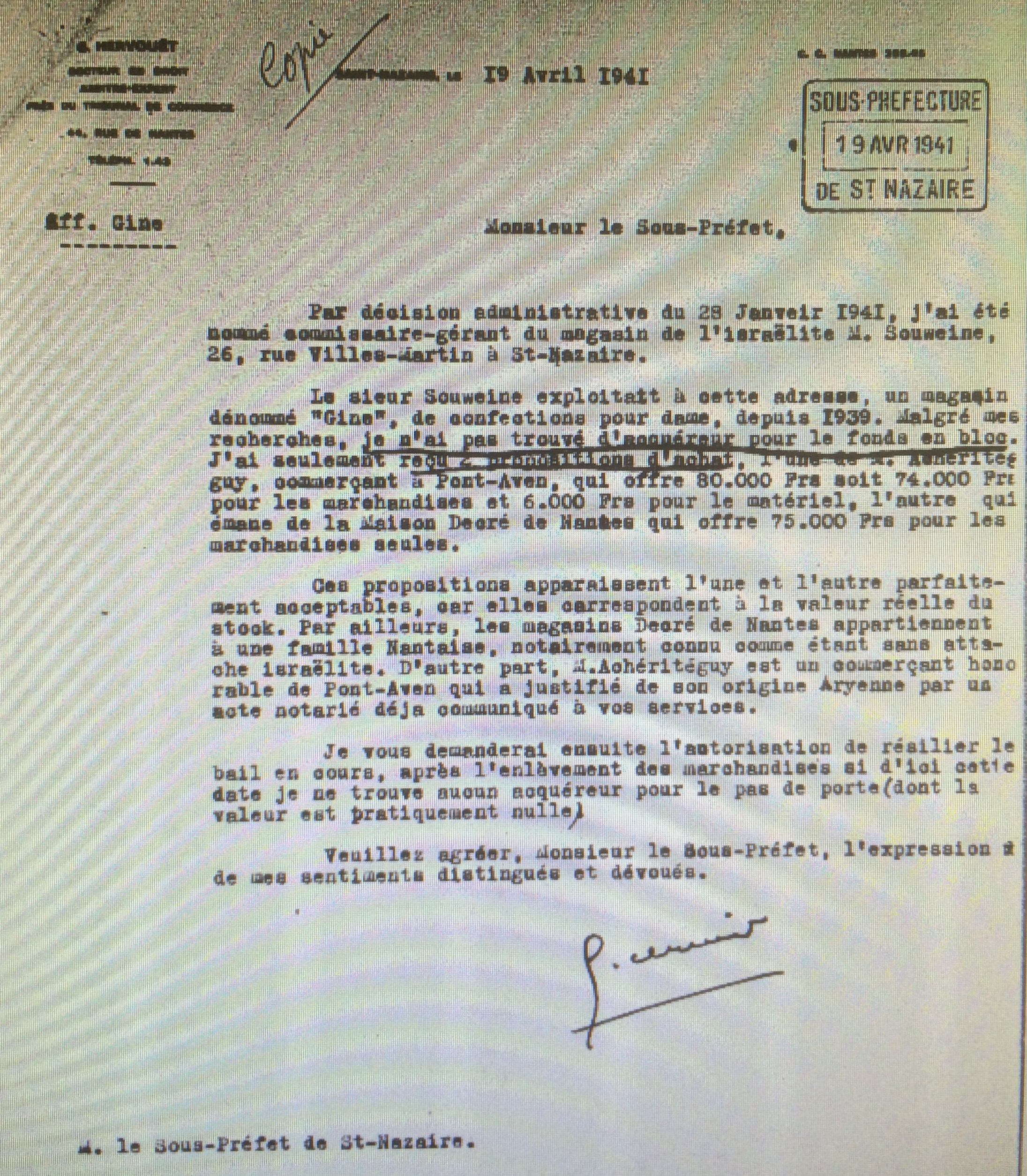 L’affichette « Judische Gesellschaft/Entreprise Juive » est apposée sur la devanture du magasin, les scellés y sont apposés le 03 décembre 1940, un inventaire est dressé le 10 du même mois et un administrateur provisoire est nommé en la personne de Gabriel HERVOUËT, arbitre de commerce 44, rue de Nantes à Saint-Nazaire pour aryaniser le commerce.