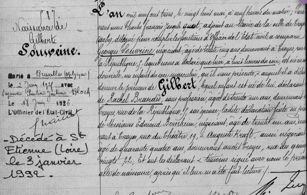 Né à Troyes le 27 mai 1903 [Père : Georges SOUWEINE, négociant et Mère : Rachel BRANDES], Gilbert est marié depuis le 02 juin 1925 à Bruxelles avec Suzanne BLOCH et le couple a trois enfants : Jean-Claude, l’aîné et les deux jumeaux Michel et Maryse nés le 29 décembre 1938 à Saint-Etienne.