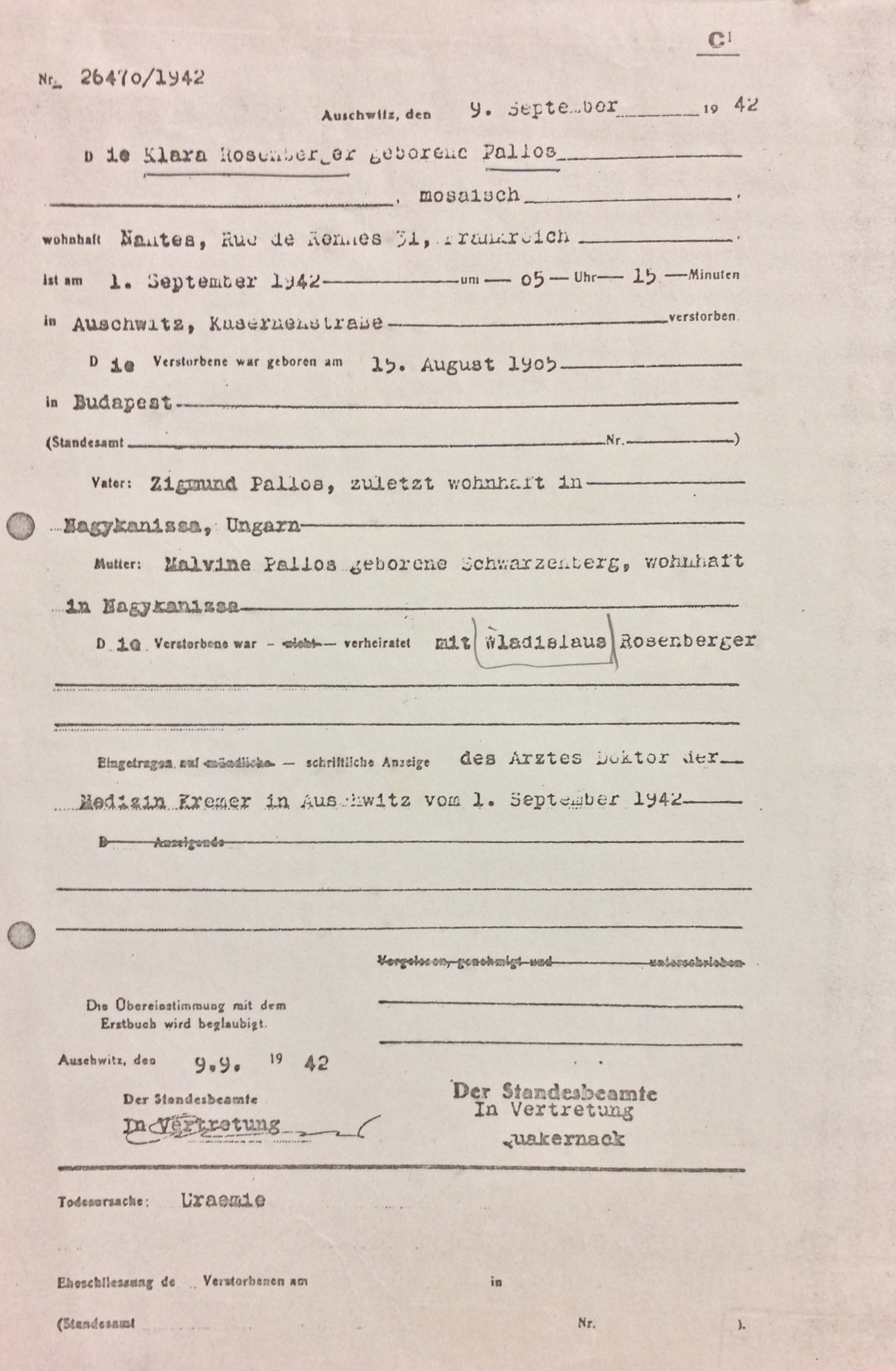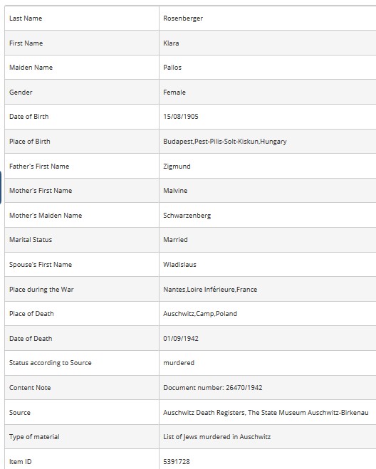 Ladislas décède à Auschwitz, il avait 37 ans. Clara qui a été enregistré dans le camp d’Auschwitz est décédée le 01 septembre 1942, à 5 heures 15 du matin, 1 mois et demi après son arrivée, elle avait 36 ans.