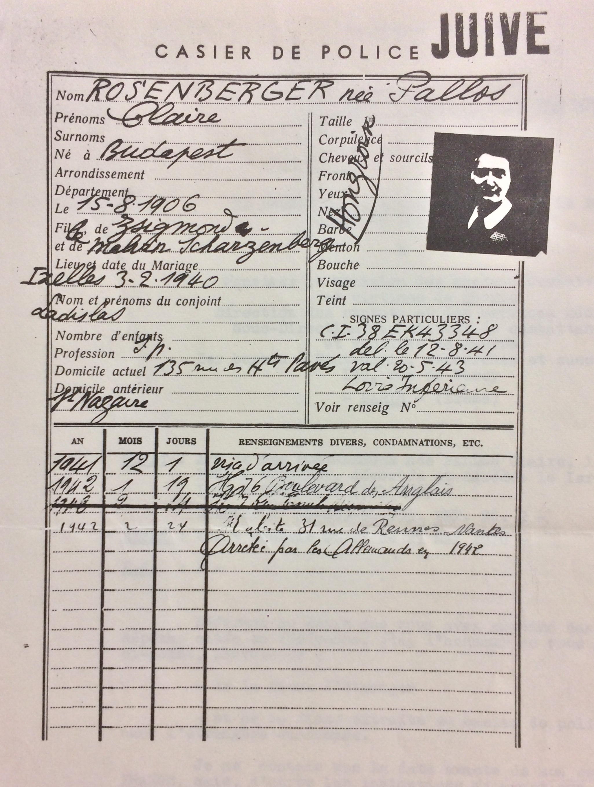 Ladislas ROSENBERGER est né le 22 février 1905 à Gelse (Hongrie) et est marié avec Klara (ou Clara ou Claire) PALLOS née le 15 août 1906 à Budapest (Hongrie) (Père Zygmund PALLOS et Mère : Malvina SCHWARZENBERG]. De nationalité hongroise, ils n’ont pas d’enfant. Les époux Rosenberger sont entrés en France le 20 mai 1940 par Dunkerque arrivant de Belgique se dirigent sur Angers où ils arrivent le 22 mai 1940 puis arrivent sur Saint-Nazaire le 24 mai 1940. Ils s’étaient mariés peu de temps auparavant le 03 février 1940 à Ixelles.