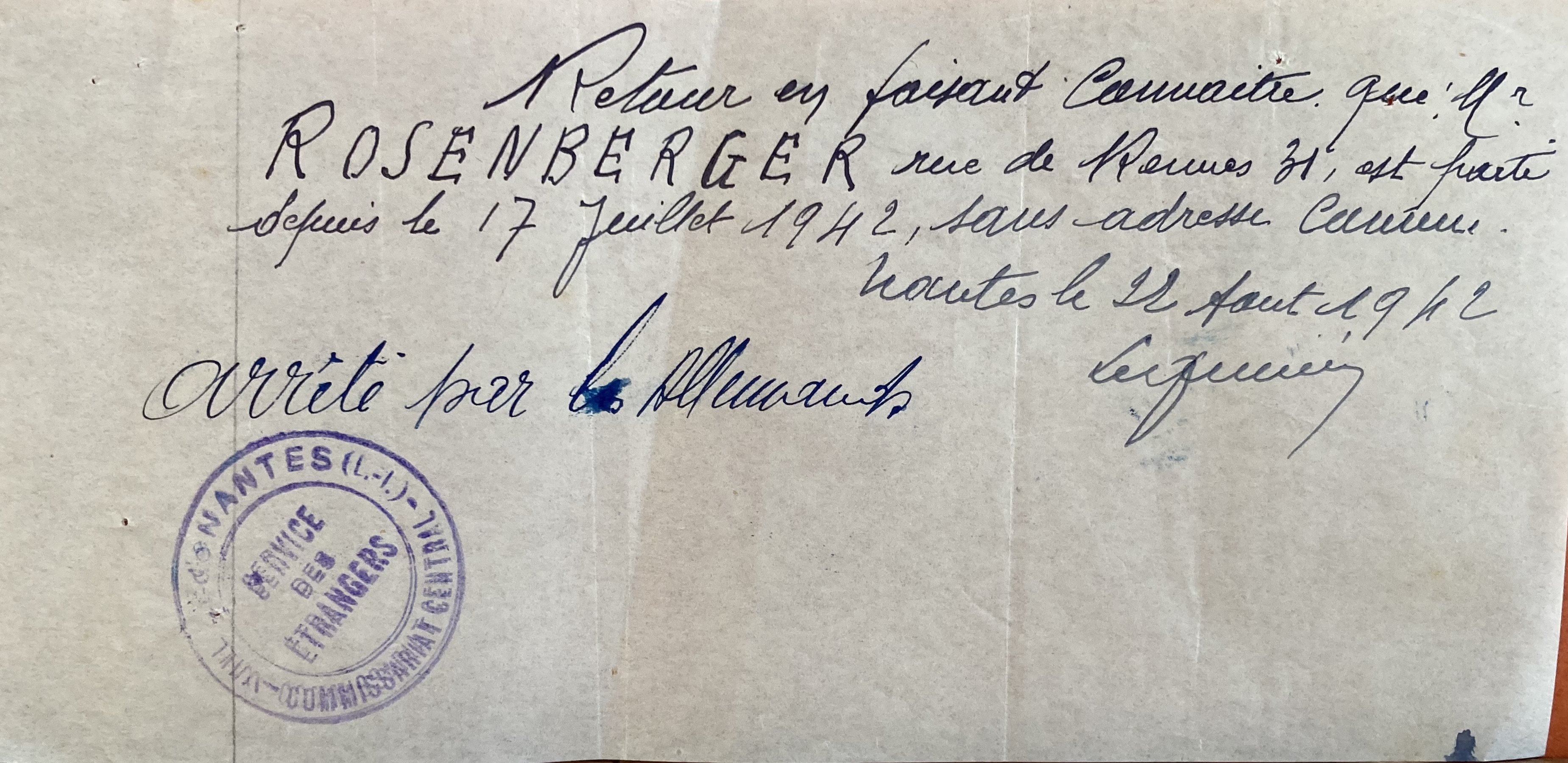 Entre le 27 septembre et le 20 octobre 1940, Ladislas ROSENBERGER se fait recenser auprès de la sous-préfecture de Saint-Nazaire sous le numéro 78. les tampons Juif et Juive sont apposés à l’automne 1940 sur leur nouvelle carte d’identité d’étranger.