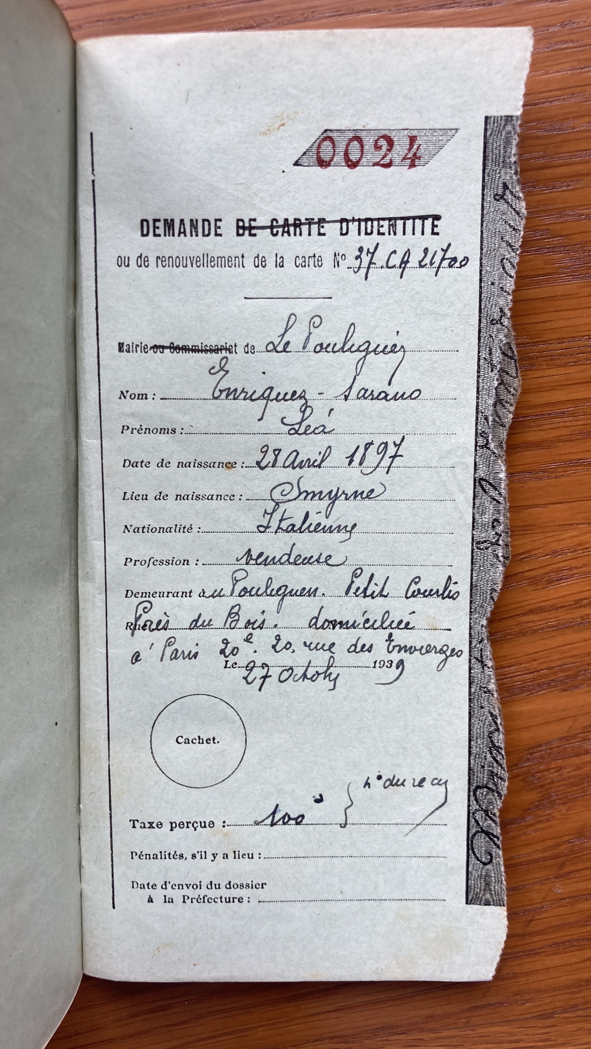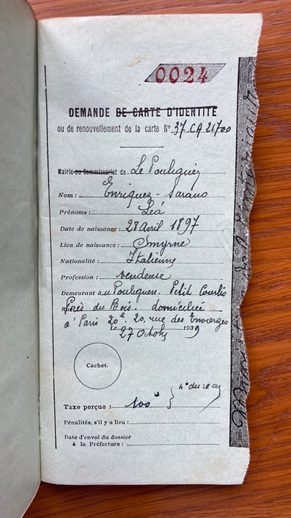 Léa, célibataire, et son père Jacob ENRIQUEZ SARANO sont réfugiés au Pouliguen arrivant de Paris où ils résident au 20, rue des Envierges dans le 20ème arrondissement. Léa s’occupe de son père âgé et exerce la profession de vendeuse au 7, place de la République (Paris, 3ème arrondissement).
