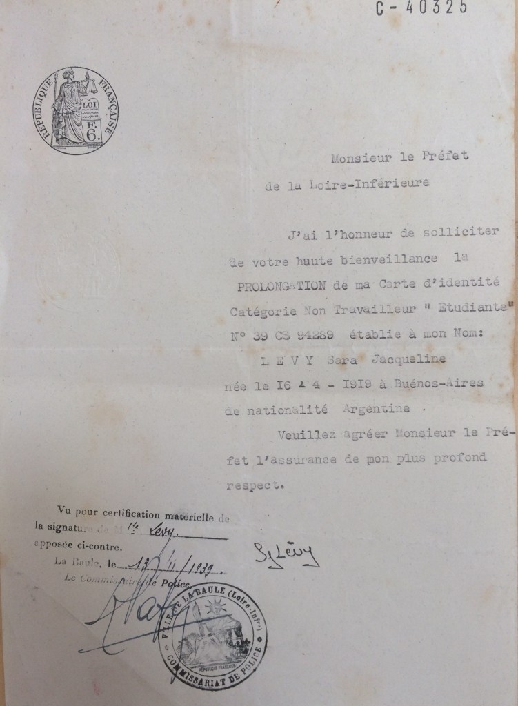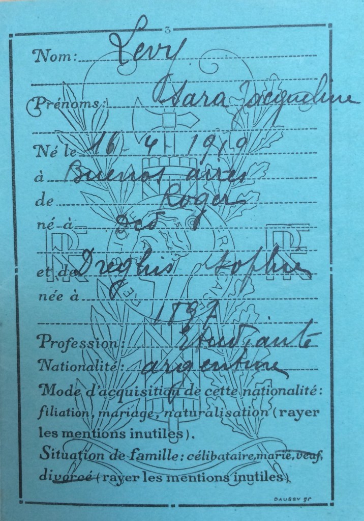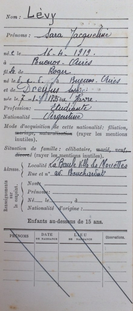 Jacqueline LEVY est née le 16 avril 1919 à Buenos Aires [Père : Roger LEVY et mère : DREYFUS Sophie née au Havre le 07 janvier 1895]. Son père est décédé au Havre et Sophie LEVY élève donc seule sa fille qui se remariera en 1938 avec Jean GRUMBACH.