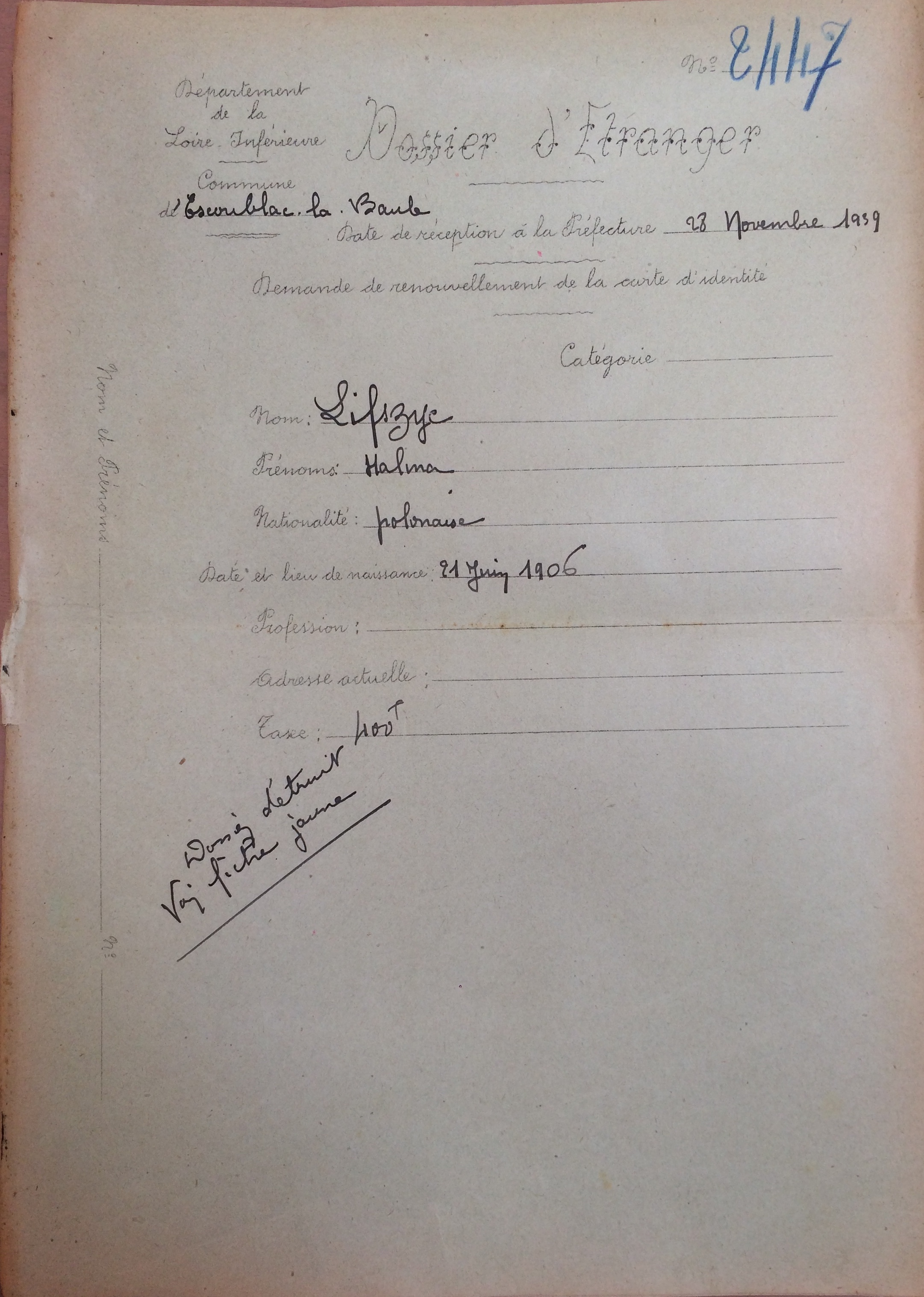 Dossier d’étranger d’Halina LIFSZYC [ADLA 4M938]