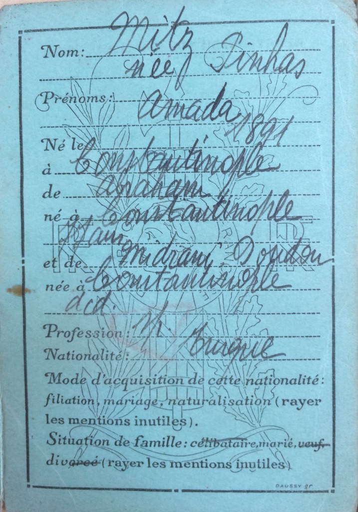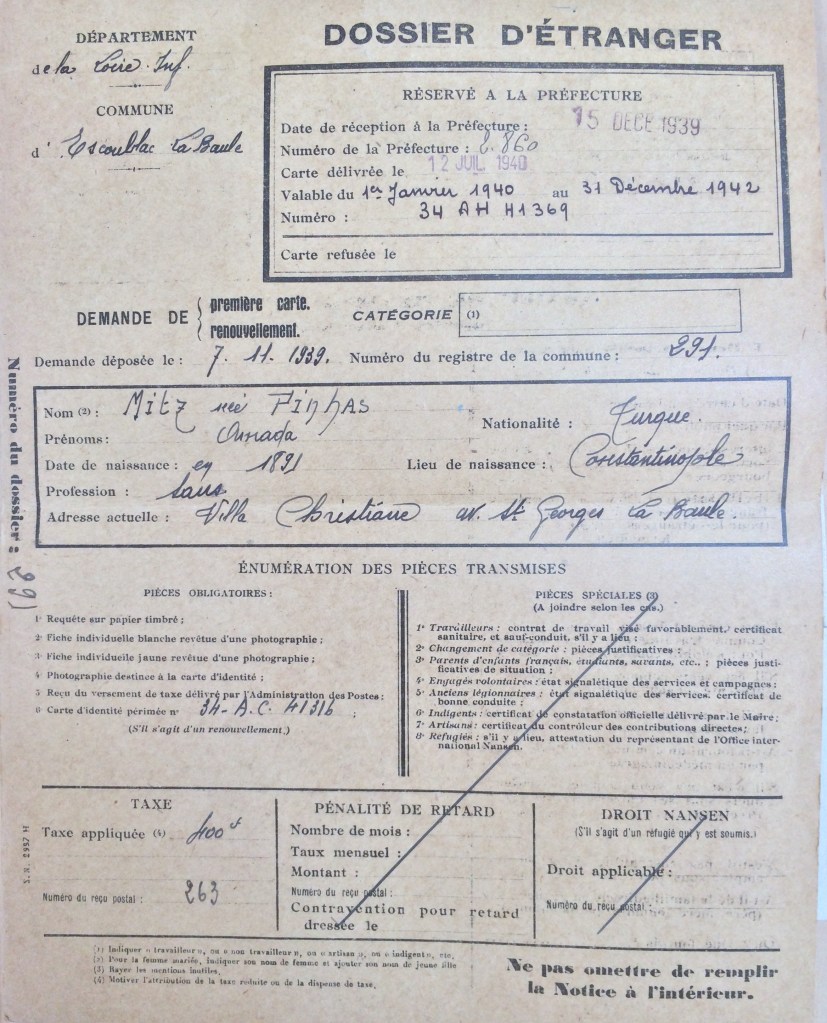 Amada MITZ (née PINHAS) est née en 1891 à Constantinople [Père : Abraham PINHAS et mère : Doudou MIDRANI] et est mariée avec Sabetaï MITZ né aux alentours des années 1880 à Andrinople. Le couple est réfugié depuis au moins novembre 1939 à la Baule Villa Christiane avenue Saint-Georges jusqu’au 19 février 1940, date à laquelle il rejoint Paris au 3, rue Ernest Gouin dans le 17ème arrondissement. Le couple a au moins un enfant, Haïm, né en 1925 à Constantinople. La famille n’a pas été déportée.