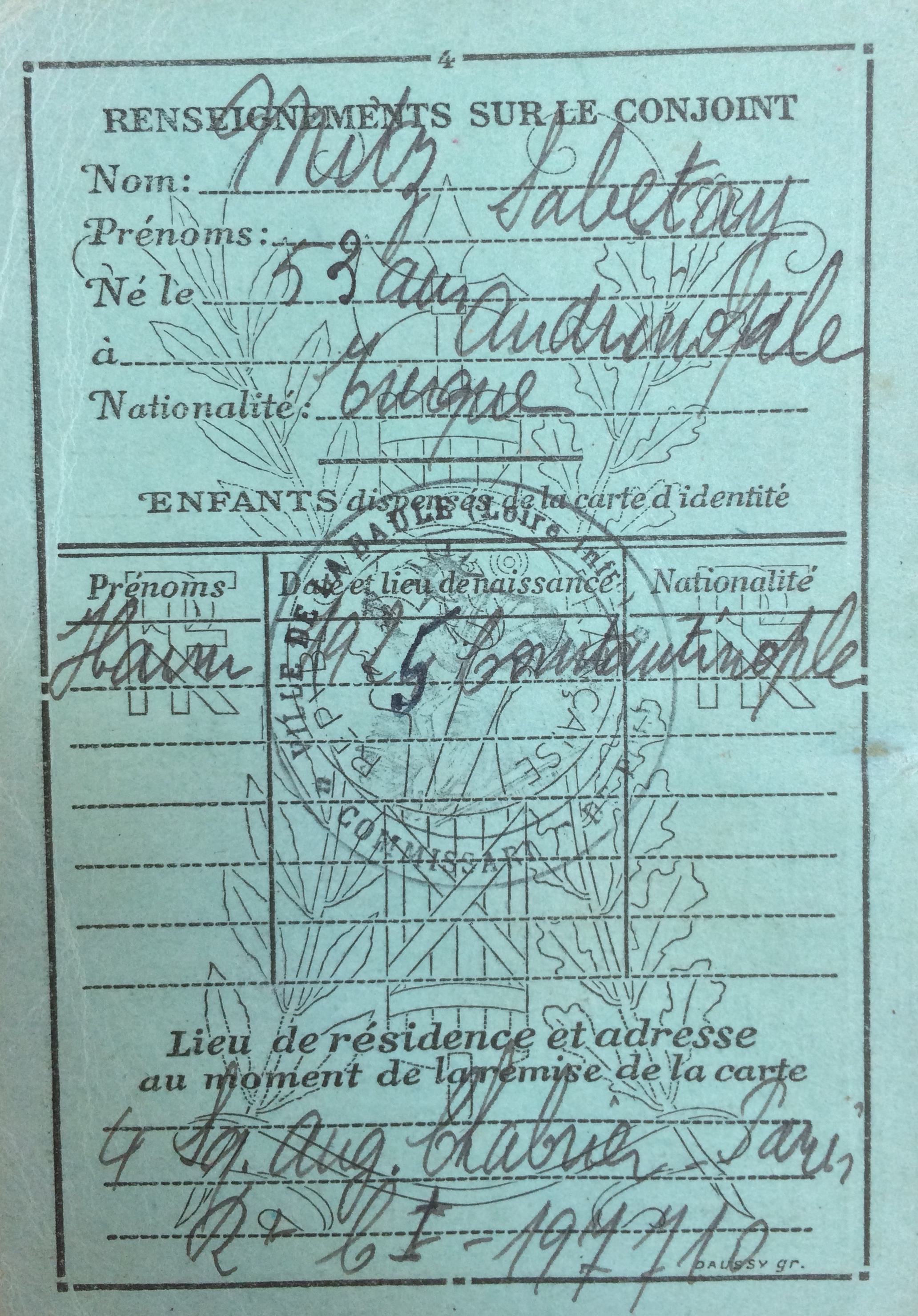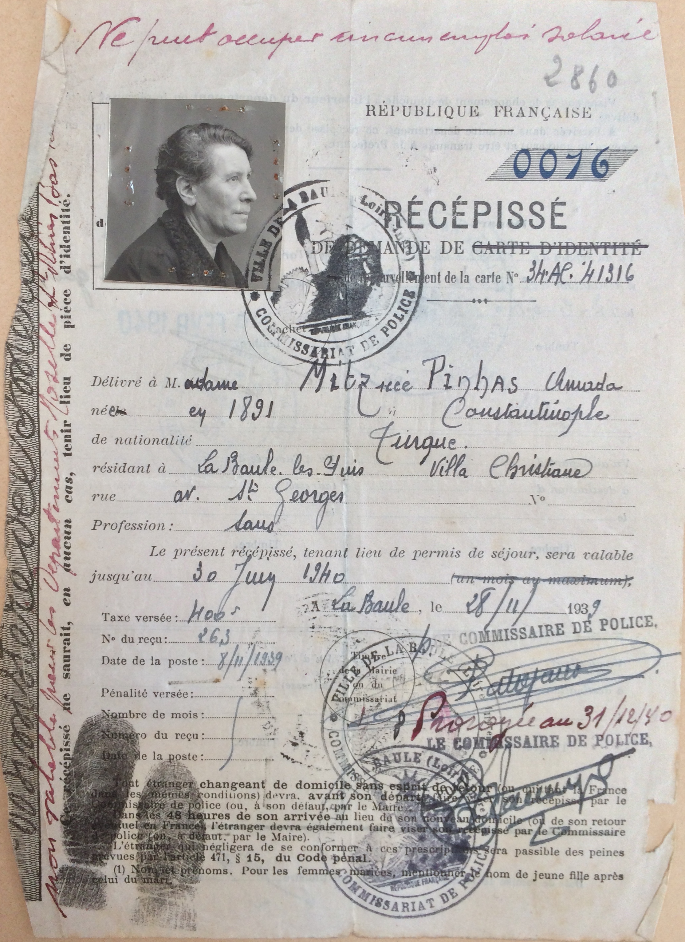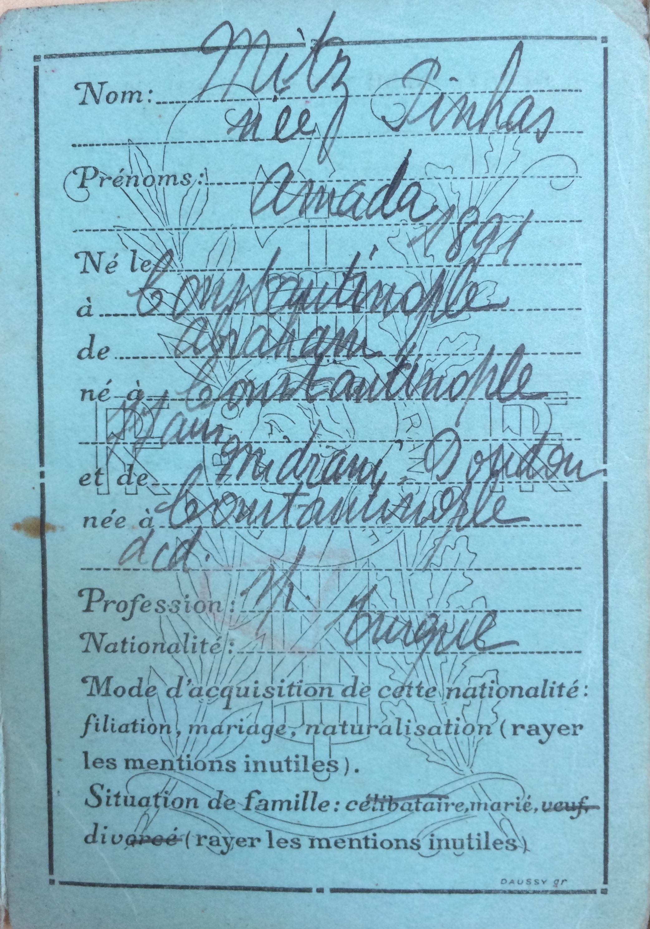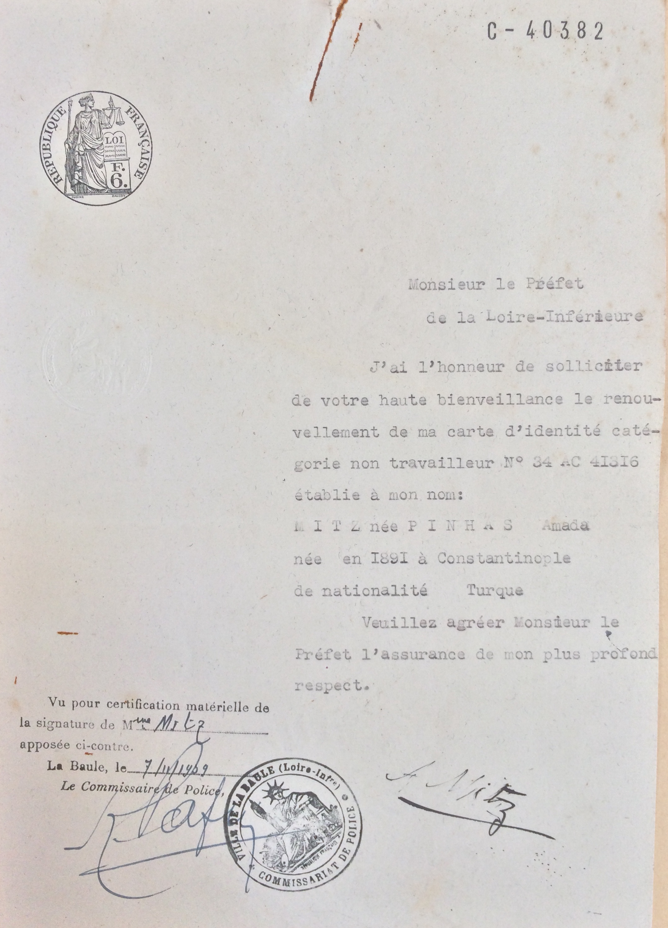 Amada MITZ (née PINHAS) est née en 1891 à Constantinople [Père : Abraham PINHAS et mère : Doudou MIDRANI] et est mariée avec Sabetaï MITZ né aux alentours des années 1880 à Andrinople. Le couple est réfugié depuis au moins novembre 1939 à la Baule Villa Christiane avenue Saint-Georges jusqu’au 19 février 1940, date à laquelle il rejoint Paris au 3, rue Ernest Gouin dans le 17ème arrondissement. Le couple a au moins un enfant, Haïm, né en 1925 à Constantinople. La famille n’a pas été déportée.