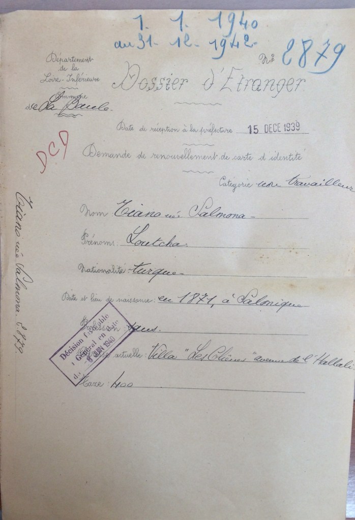 Loutcha TIANO née SALMONA est née en 1871 à Salonique et est mariée avec Samuel TIANO né en 1872 dans la même ville. Ils sont arrivés de Paris du 13 rue Molitor dans le 16ème arrondissement où ils résident habituellement à La Baule où ils logent Villa « Les Chênes » avenue de l’Hallali le 05 septembre 1939. Ils n’ont pas été déportés.