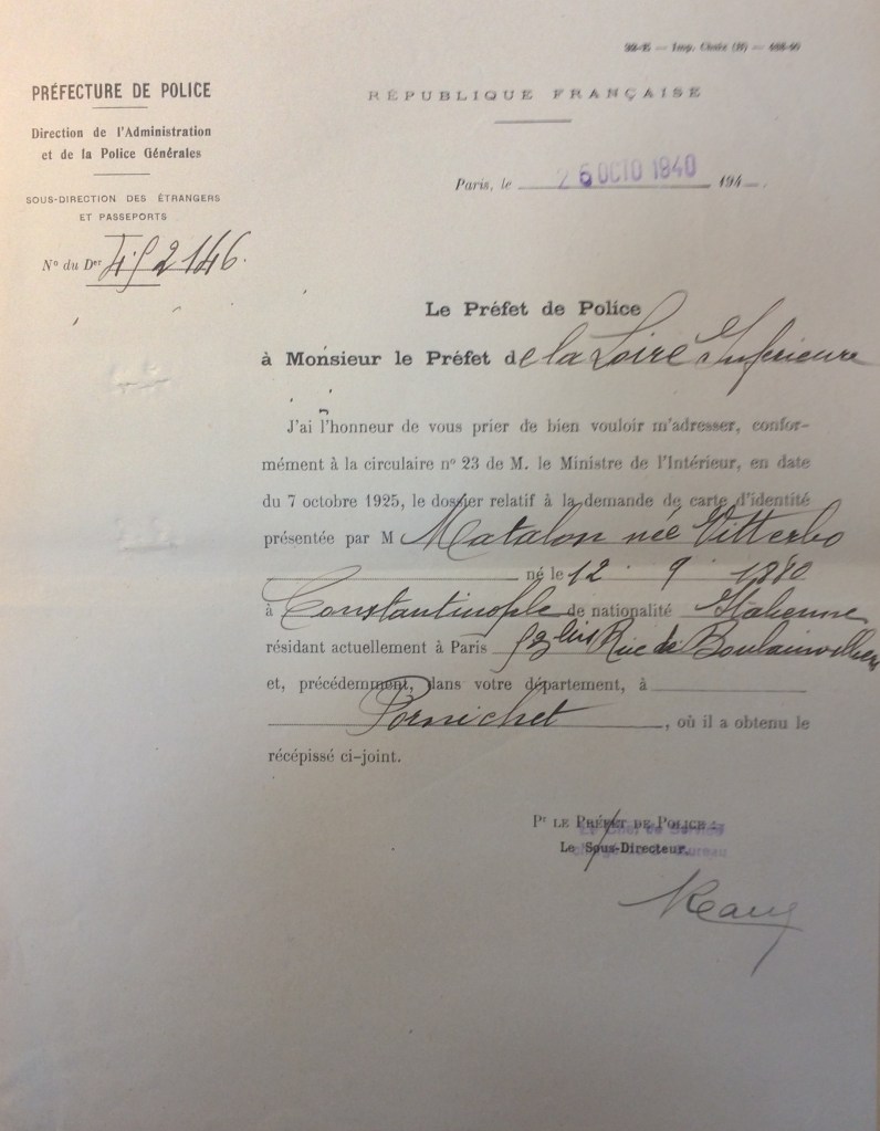 Corinne née VITERBO née le 12 septembre 1881 à Constantinople est veuve depuis le 23 septembre 1938 puisque son mari Albert né le 14 septembre 1875 à Salonique [Père : Samuel MATALON et Mère : Julie Errera] est décédé à Garches (Seine-et-Oise). La famille habite au 53 bis, rue Boulainvilliers dans le quartier de la Muette dans le 16ème arrondissement à Paris.