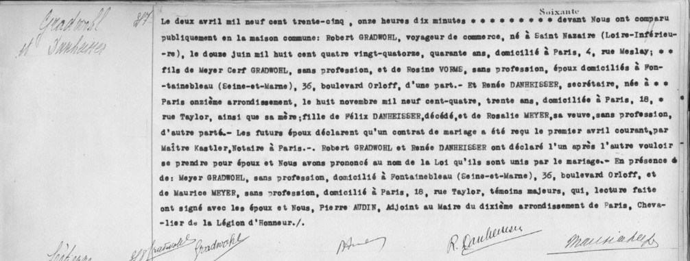 Robert se marie le 02 avril 1935 à Paris (10ème arrondissement) avec Andrée DANHEISSER née le 08 novembre 1904 à Paris (11ème arrondissement). [Père : Félix DANHEISSER et Mère : Rosalie MEYER] Robert exerce la profession de représentant de commerce et Andrée celle de secrétaire au moment de leur mariage.