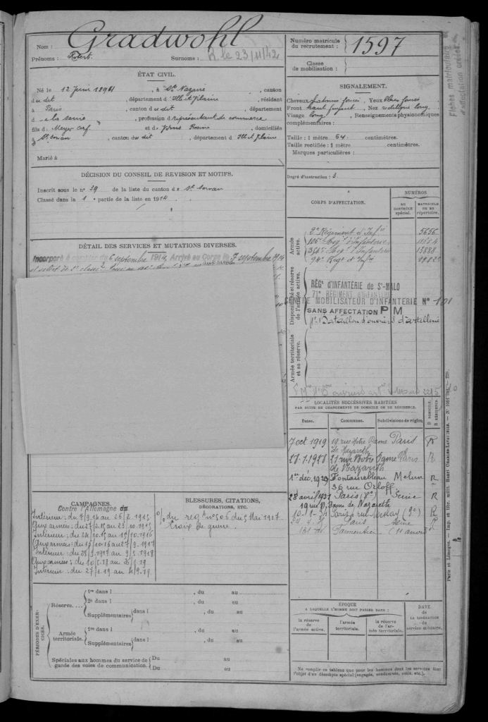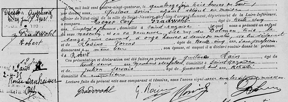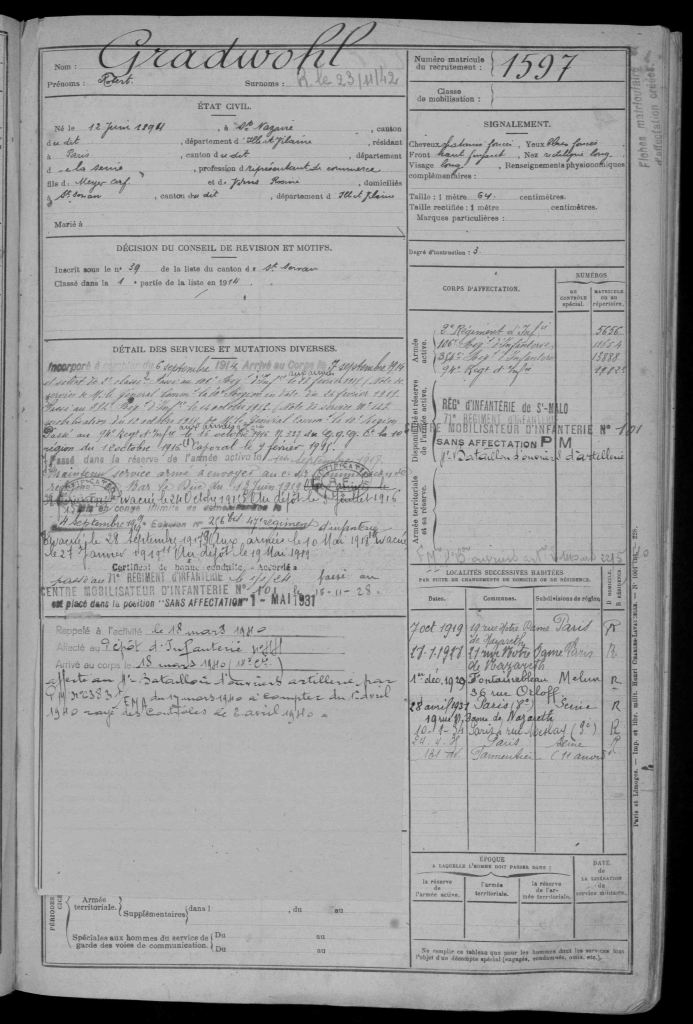 Robert GRADWOHL est né à Saint-Nazaire le 12 juin 1894 [Père : GRADWOHL Meyer Cerf né en 1859 et Mère : VORMS Rosine née en 1859]. Il est issu d’une très vieille famille juive alsacienne installée depuis au moins le milieu du XVIIIème siècle dans le Bas-Rhin. Meyer Cerf, qui a par ailleurs 11 frères et soeurs, exerce la profession d’employé de commerce au moment de la naissance de son fils et réside 3, rue du Dolmen à Saint-Nazaire. Robert a au moins un frère : Marcel né le 13 avril 1892 à Saint-Nazaire. La famille se déplace en Ille-et-Vilaine à Saint-Sevran-sur-Mer au moins peu avant la première guerre mondiale.