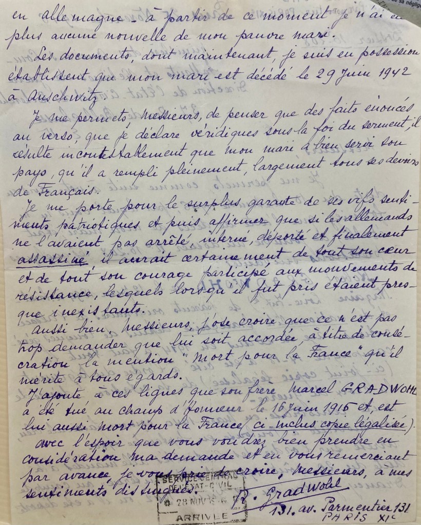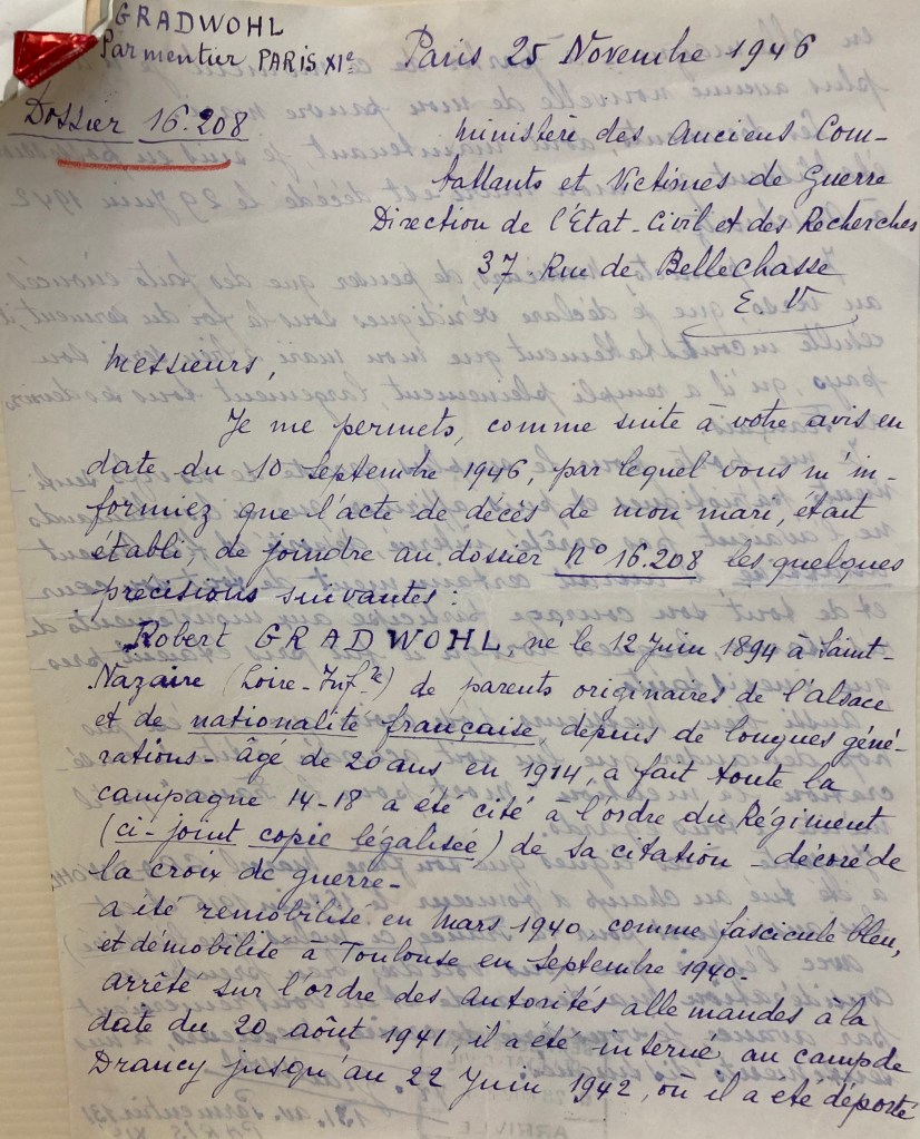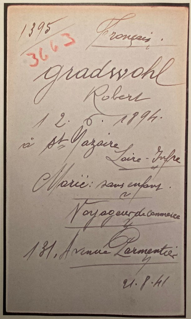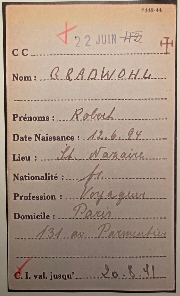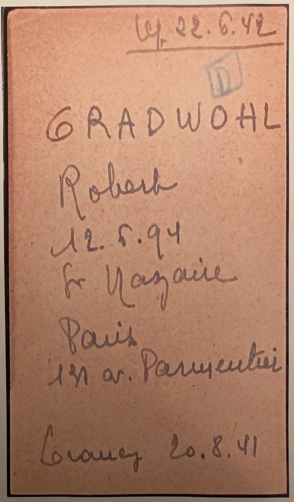 Robert GRADWOHL est arrêté le 20 août 1941 lors de la rafle dite du XIème arrondissement à Paris organisée du 20 août au 24 août 1941 et qui touchera d’autres arrondissements. Elle concerne uniquement les hommes de 18 à 50 ans et provoquera l’arrestation de 4232 personnes dont Robert qui se retrouve interné à compter du 20 ou 21 août 1941 au camp de Drancy jusqu’au 22 juin 1942. Cette rafle marque le changement de destination du camp de Drancy, au départ réquisitionné par les allemands comme Fronstalag (prisonniers de guerre) et qui devient le camp d’internement des Juifs en zone occupée. Il y loge Bloc I, escalier 1, chambre 1 et au Bloc 2, escalier 9.