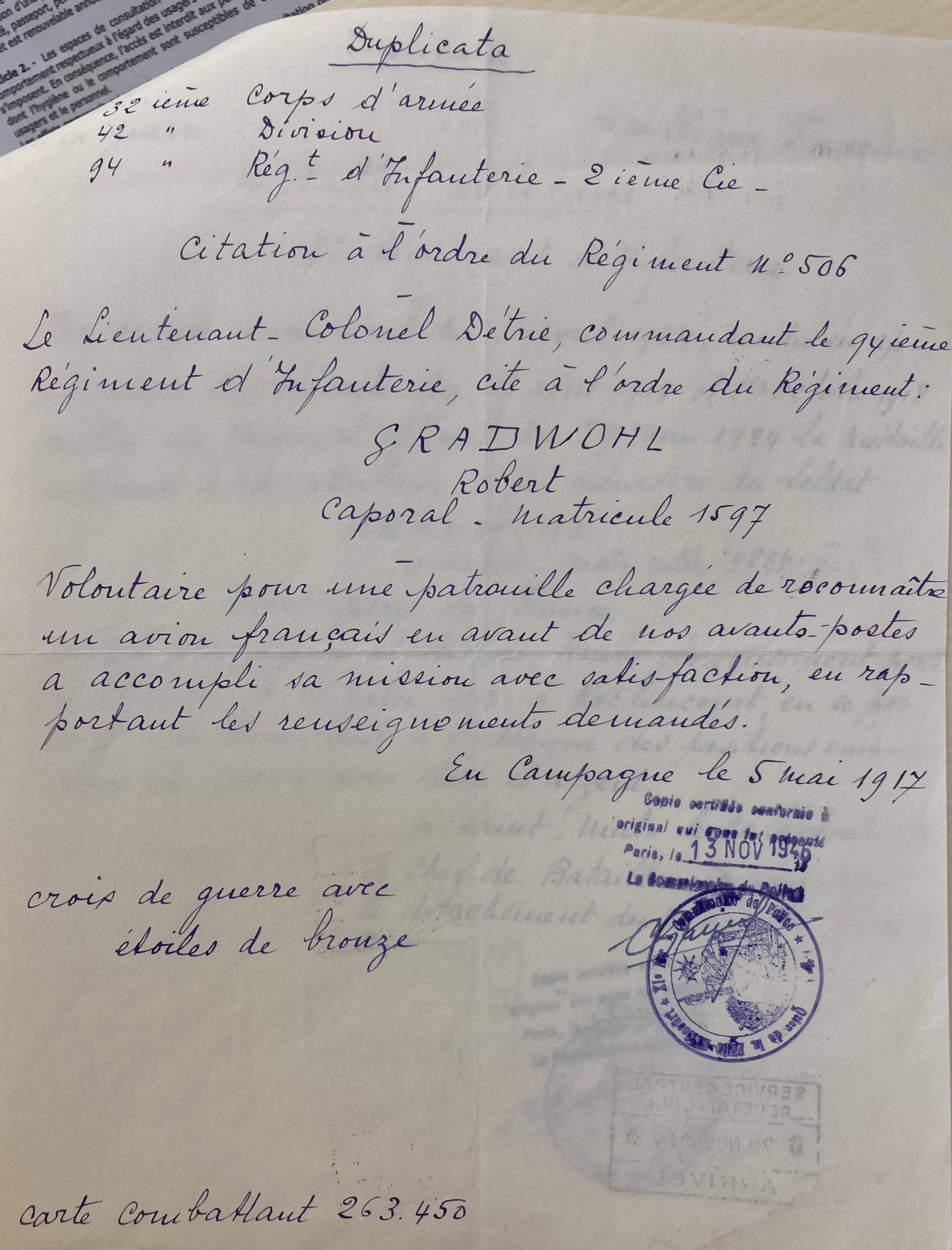 Il terminera la guerre au grade de caporal et recevra pour ses faits de guerre, la croix de guerre avec étoile de bronze ainsi qu’une citation à l’ordre du régiment.