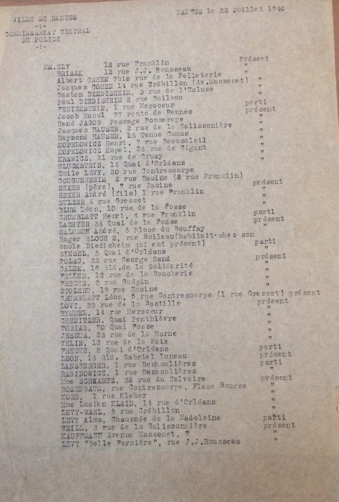 Le 22 juillet 1940 et bien avant le recensement d’octobre 1940, le Commissariat Central de Police de Nantes dresse une liste des commerçants Juifs présents dans la ville de Nantes. Emile LEVY y apparaît et est donc présent au milieu de l’été. En revanche la famille LEVY n’apparaît pas dans le recensement des Juifs d’octobre 1940.