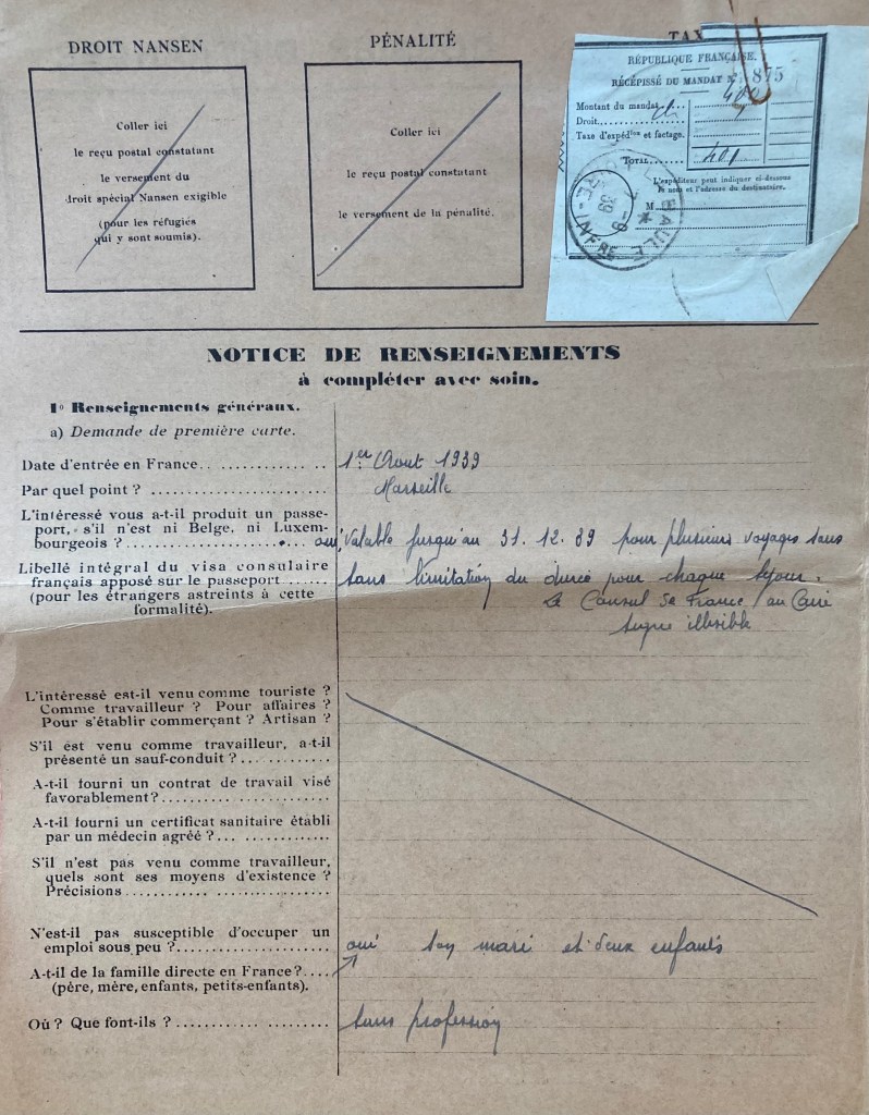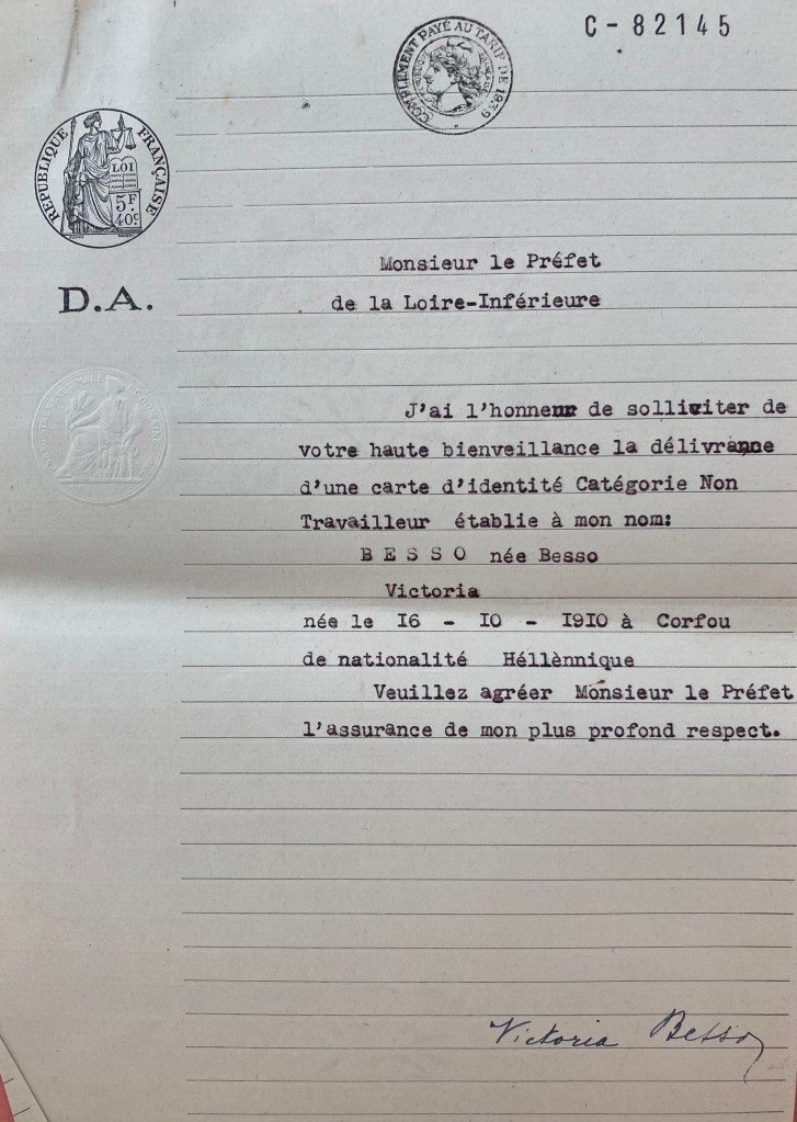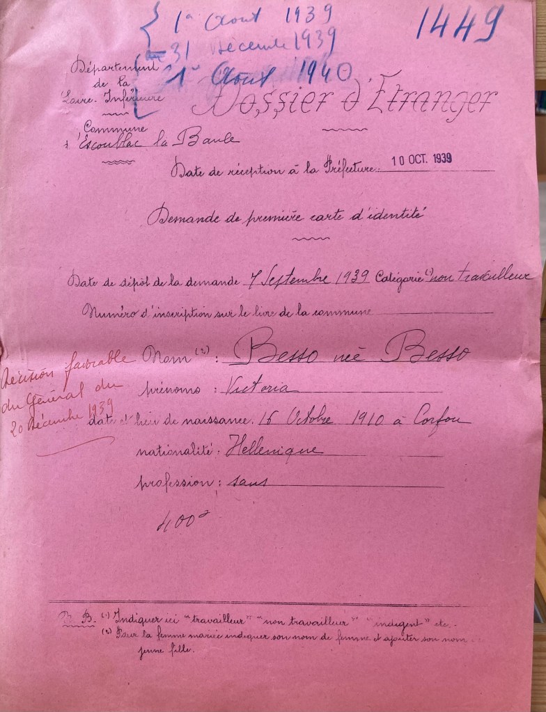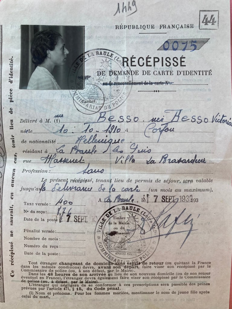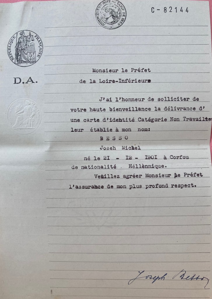 Joseph BESSO est né le 21 décembre 1901 à Corfou (Grèce) et est marié avec Victoria BESSO née BESSO née le 16 octobre 1910 à Corfou. Ils ont deux enfants : Marc Ouriel né à Paris vers 1931 et Marize Astrite née vers 1935 à Paris. De nationalité grecque, ils arrivent en France le 1er août 1939 par Marseille provenant d’Egypte avec un visa obtenu auprès du Consulat Général de France au Caire valable six mois jusqu’au 31 décembre 1939.