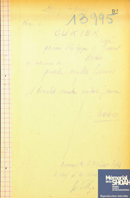 A son arrivée à Drancy, Laja CUKIER est dépossédée de tous ses biens, à savoir la somme de 4000 francs (vraisemblablement toutes ses économies) et un bracelet montre en métal jaune.