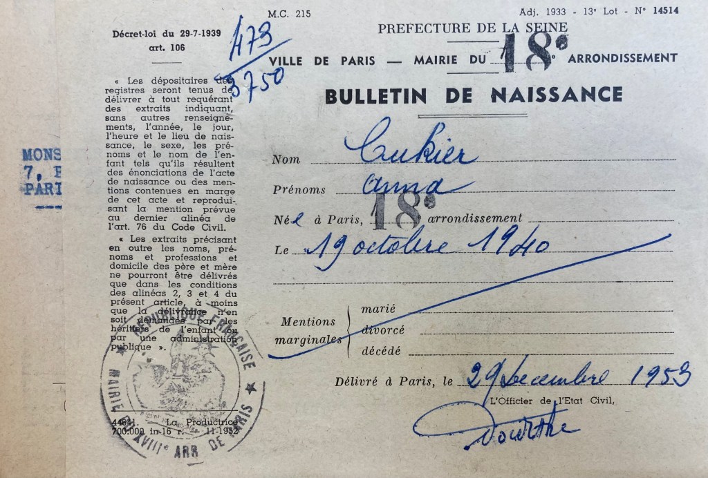 A son retour à Paris, naît Anna le 19 octobre 1940 dans le 18ème arrondissement.
