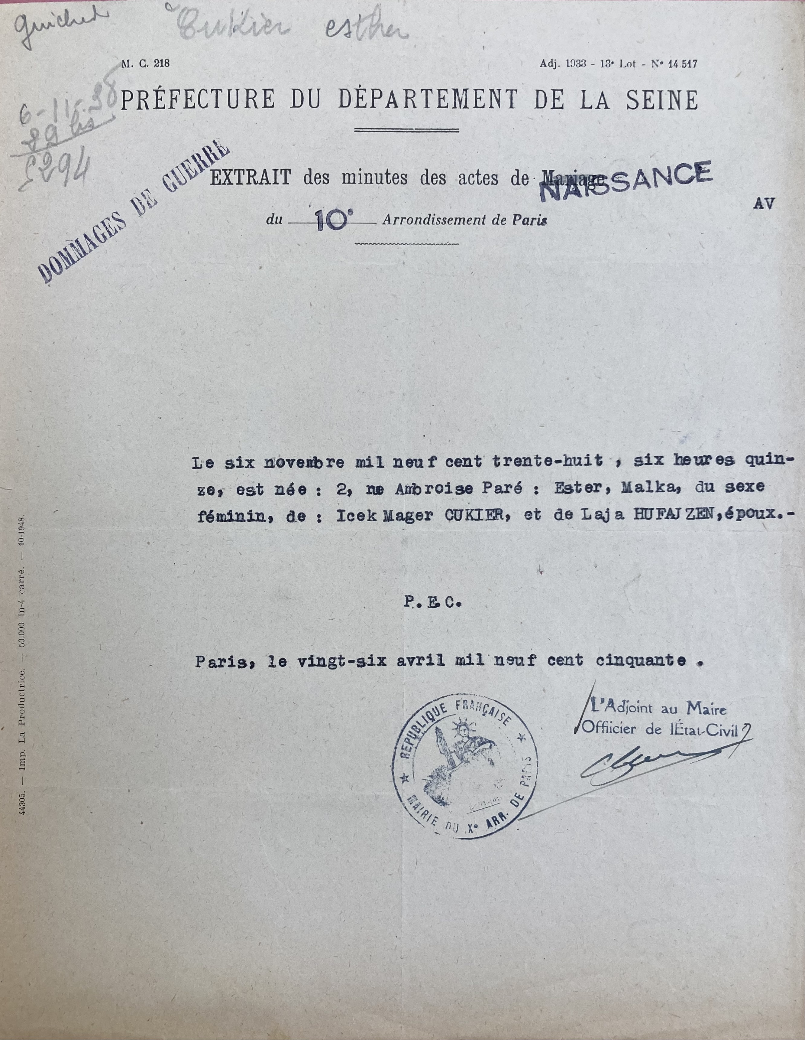 Le couple donne naissance le 06 novembre 1938 à Ester (ou Esther), Malka à Paris (10ème arrondissement).