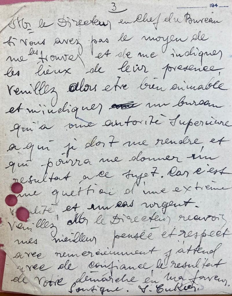 Icek n’a pas été déporté. Affecté dans un régiment étranger rattaché à la Légion Etrangère en 1939/1940, le 6ème REI, dont une partie se dirige sur le Liban, il est présent en 1946 à Beyrouth. C’est de là qu’il écrit au moins deux lettres l’une le 15 août 1946 et l’autre le 30 octobre 1946 et supplie toutes les autorités pour retrouver ses deux filles et son épouse qu’il espère toujours vivantes