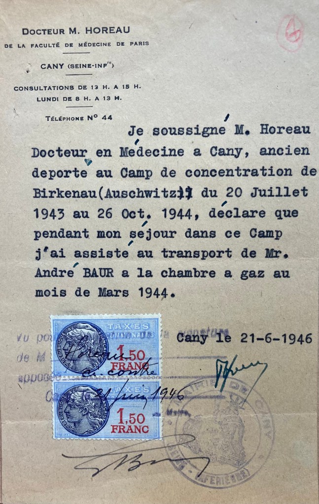André a été sélectionné pour rentrer dans la partie concentrationnaire d’Auschwitz et est dirigé sur le camp de Monowitz (situé près de l’usine IG Farben). Selon les docteurs HOREAU, HOLITZ et HIRSCH, André a été envoyé à la chambre à gaz en mars 1944. Selon un certain lieutenant BORIS, André BAUR membre de l’UGIF (sans précision de date de naissance) aurait été « exécuté par gaz le 21 janvier 1944« .