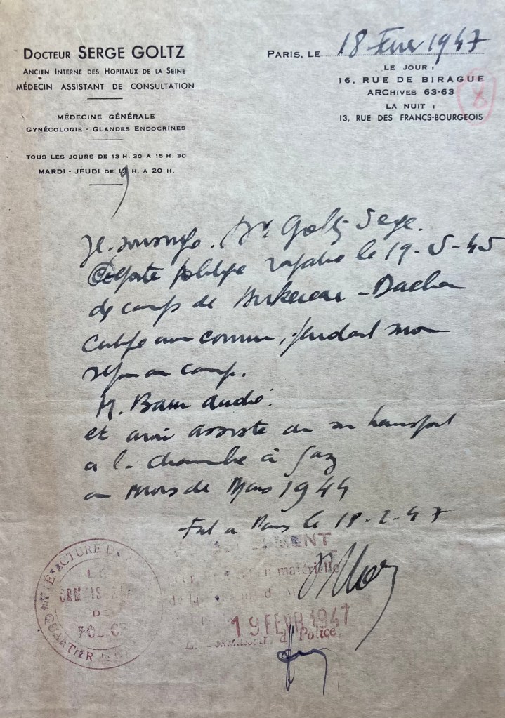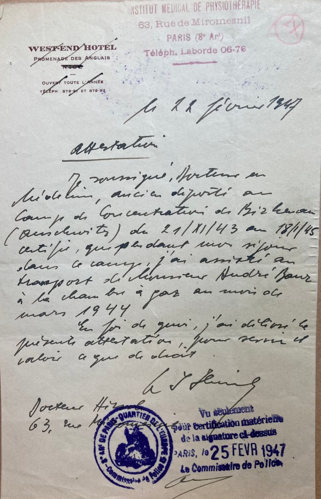 André est donc interné comme otage à Drancy le 21 juillet 1943, ce qui est par ailleurs précisé dans les circonstances de l’arrestation dans son dossier de la DAVCC.
