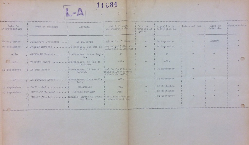 Fernand SULZBACH n’est ni recensé en tant que Juif sur l’arrondissement de Saint-Nazaire, ni sur celui de Nantes en octobre 1940. Aucune information sur la manière dont il a pu être arrêté. D’après les informations communiquées par la famille, Fernand SULZBACH qui est arrêté en tant que Juif ne l’est pas. Son épouse Alice va remettre un certificat de baptème aux Autorités Allemandes, ce qui va permettre sa libération. La question se pose bien évidemment de la raison pour laquelle il a été arrêté en tant que tel (dénonciation ?).